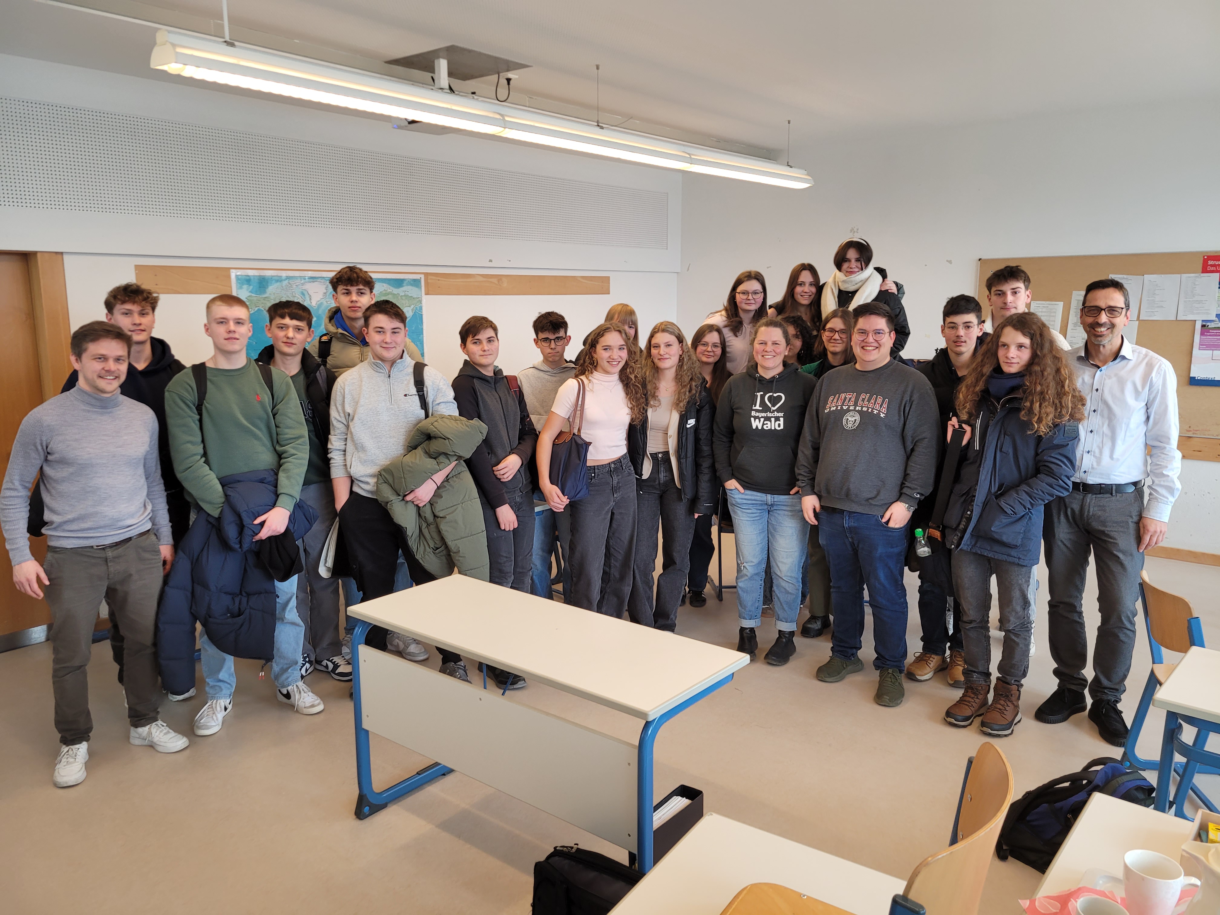Für Markus Reiter (l.), Stephanie Fichtl (3. von rechts vorne), Wirtschaftslehrer Albrecht Müller (r.) war der Workshop ein toller Erfolg: die Schülerinnen und Schüler der Klasse 10b gingen mit spannenden Ideen, viel Motivation und einem breiten Lächeln nach Hause.