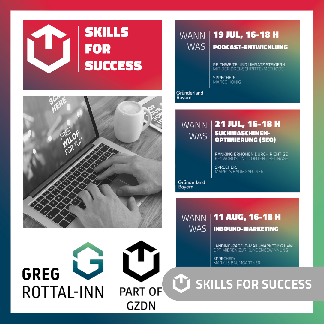 „Skills for Success“ sind nicht nur für alle Gründer:innen, Startup-Teams und Unternehmer:innen das notwendige Rüstzeug für erfolgreiches Entrepreneurship. Durch entsprechende Expertenvorträge soll praxisnahes Wissen an alle Interessierte aus der Region vermittelt werden. Aktuell werden vom GreG im Rahmen der gemeinsamen Eventreihe des Gründerzentrums Digitalisierung Niederbayern (GZDN) folgende Termine angeboten: