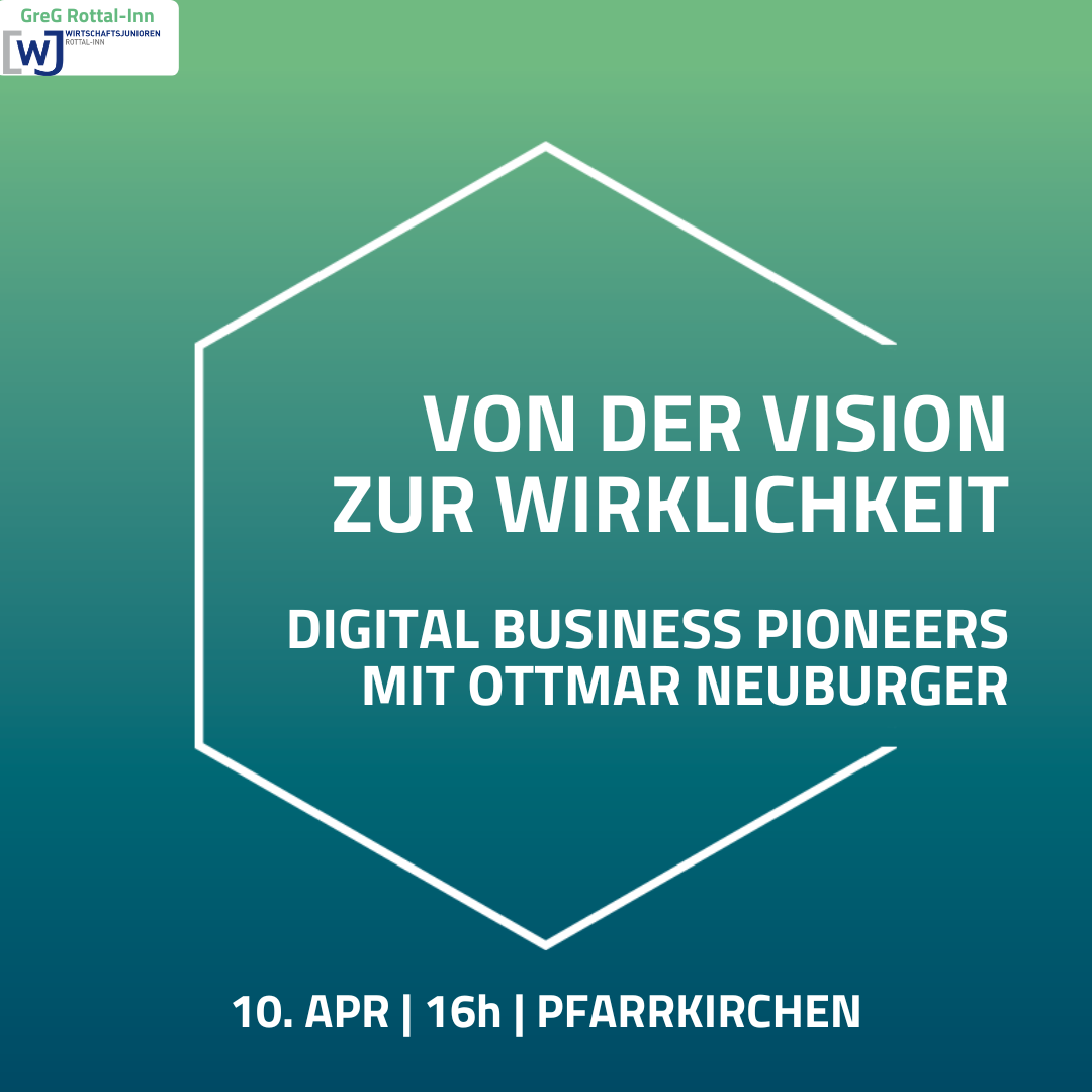 Als Digital Business Pioneers bezeichnen Markus Baumgartner, Vorstandsvorsitzender der Wirtschaftsjunioren Rottal-Inn und Christine Schnellhammer, Netzwerkmanagerin des GreG Rottal-Inn, passionierte Unternehmerinnen und Unternehmer aus der Region, die mit viel Tatendrang, Ideenreichtum und Pioniergeist voranschreiten, unermüdlich technologiebasierte Neuerungen entwickeln und dabei stets ein gutes Gespür für aktuelle Trends haben. „Genau diesen Persönlichkeiten wollen wir mit unserem gemeinsamen Veranstaltungsformat eine Plattform bieten, um ihre genialen Ideen und Konzepte zu präsentieren, ihren Weg zum Erfolg nachzuzeichnen, über Erfahrungen und Herausforderungen zu sprechen und andere mit ihrem Unternehmergeist zu inspirieren.“ (Christine Schnellhammer, Netzwerkmanagerin GreG RI)
