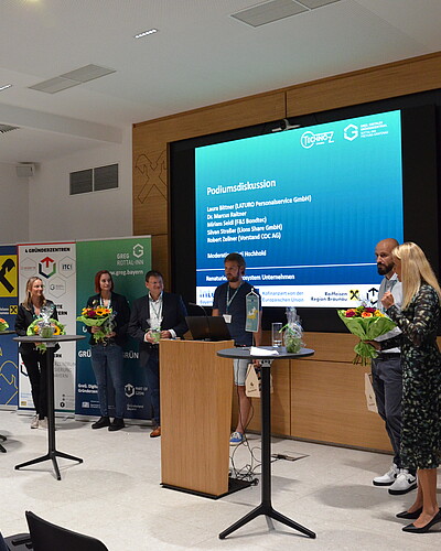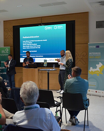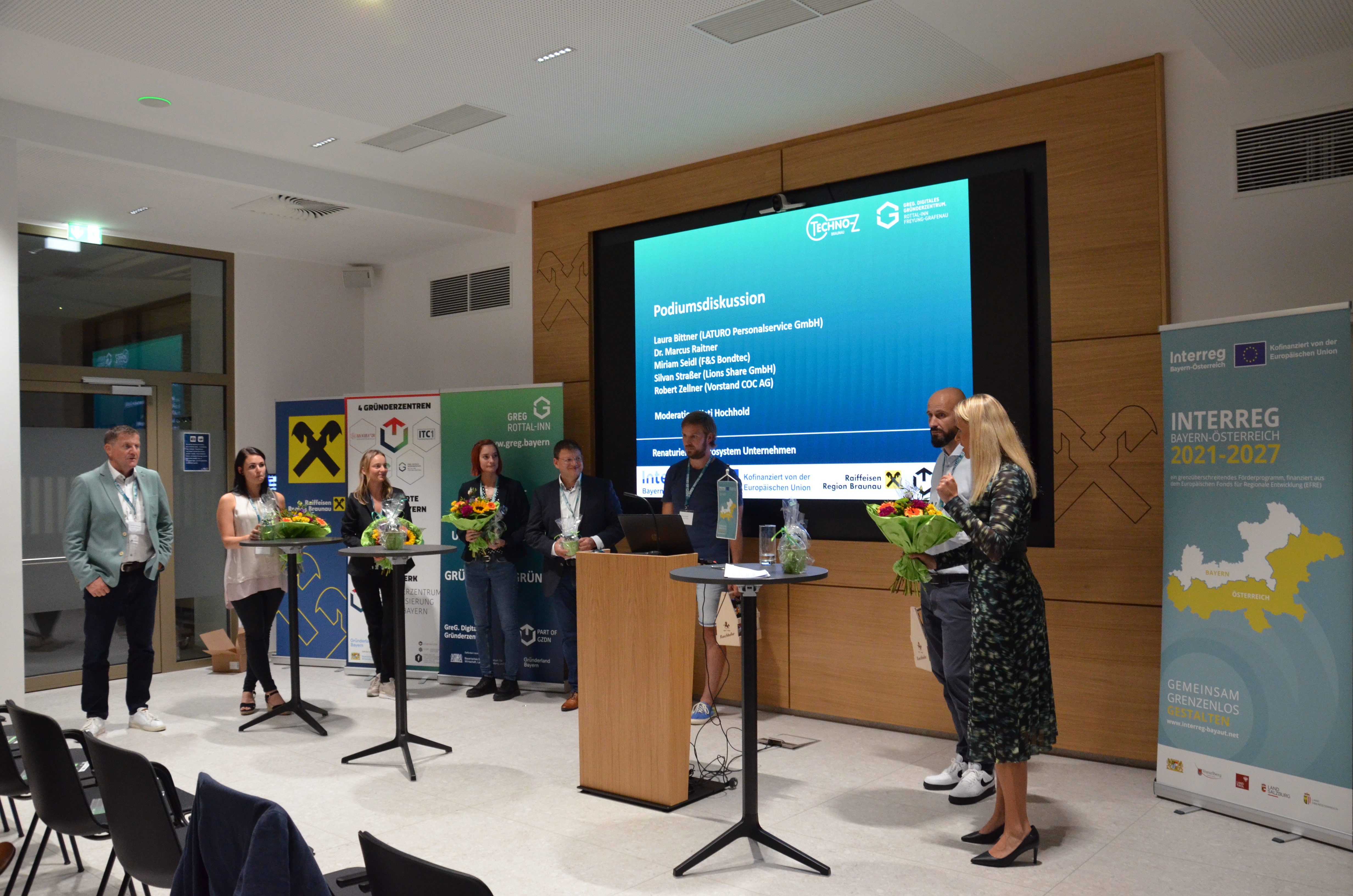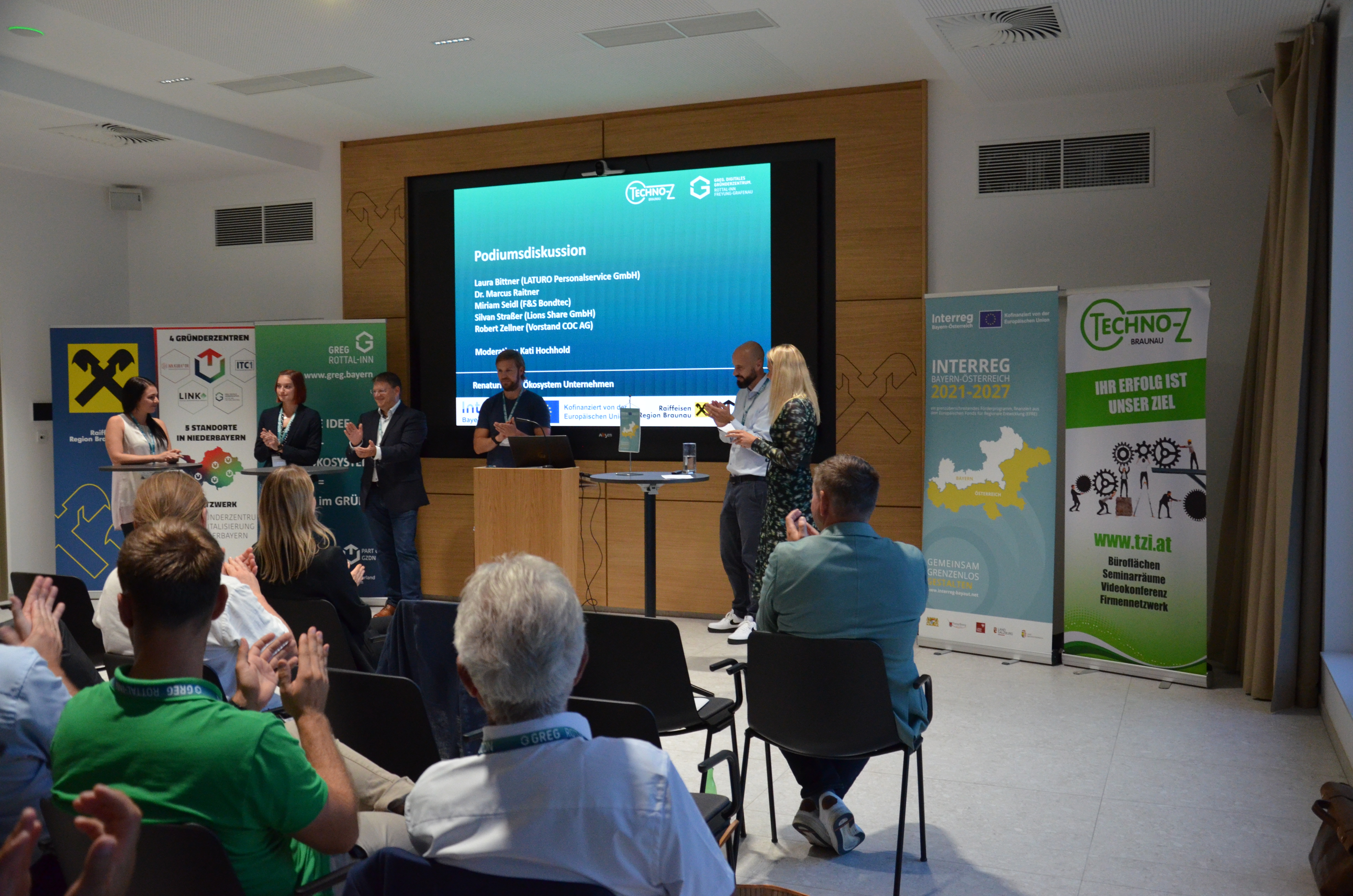 Abgerundet wurde die Veranstaltung durch eine Podiumsdiskussion, an der Unternehmer:innen aus Bayern und Oberösterreich teilnahmen. In dieser Diskussion teilten Frau Miriam Seidl, Geschäftsführerin der F&S Bondtec GmbH, Frau Laura Bittner von der LATURO Personalservice GmbH auf Braunauer Seite und Herr Silvan Straßer von der Lions Share GmbH, sowie Herr Robert Zellner, Vorstand der COC AG auf Bayerischer Seite, ihre Einblicke und Erfahrungen, wie die Einflüsse und Veränderungen der letzten Jahre die Unternehmen und ihre Führungskultur beeinflusst haben. Durch den Abend führte die charmante Moderatorin Kati Hochhold.