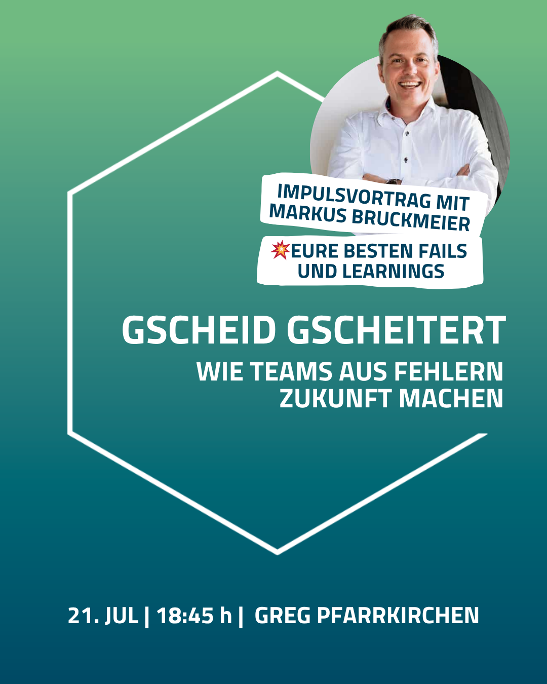 Nach der Jahreshauptversammlung dürfen wir Sie noch zu unserem Event „GSCHEID GSCHEITERT - Wie Teams aus Fehlern Zukunft machen“ (Dauer ca. 45 Minuten) einladen. Zum Abschluss des Abends gibt es noch eine sommerliche Stärkung vom Grill und kühle Getränke. Damit wir hierfür besser planen können, bitten wir Sie um eine Anmeldung unter folgendem Link bis spätestens 14.07.2025.