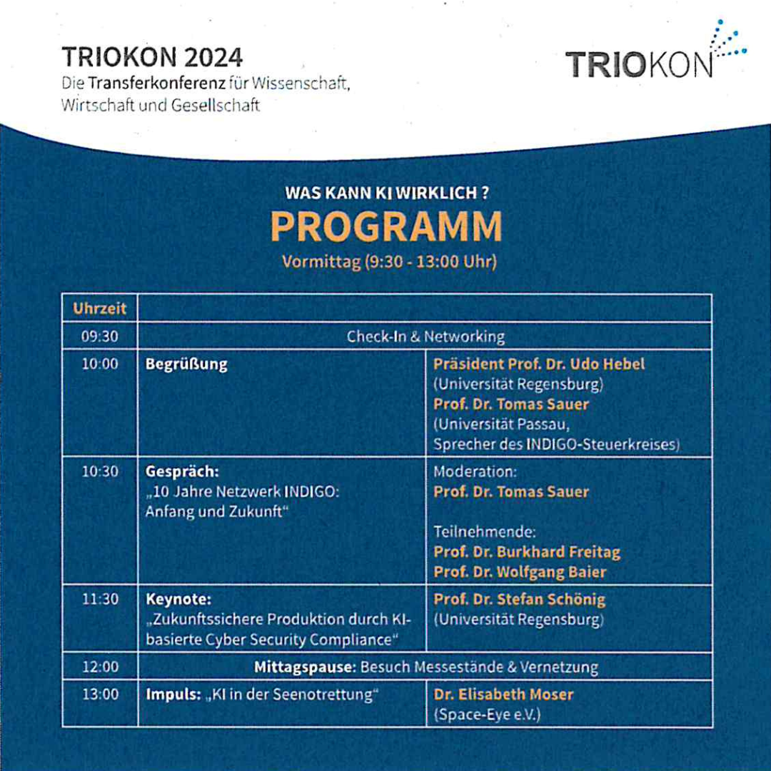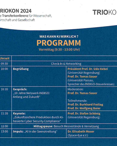 Dieses spannende Themenfeld möchten wir gemeinsam mit Ihnen auf der TRIOKON 2024 entdecken. Freuen Sie sich auf Best Practices aus der unternehmerischen Praxis, neue Impulse aus der Forschung der ostbayerischen Hochschulen sowie Gelegenheit zu Vernetzung und Austausch. Anlässlich der Konferenz feiern wir auch das 10-jährige Bestehen des Netzwerks INDIGO.