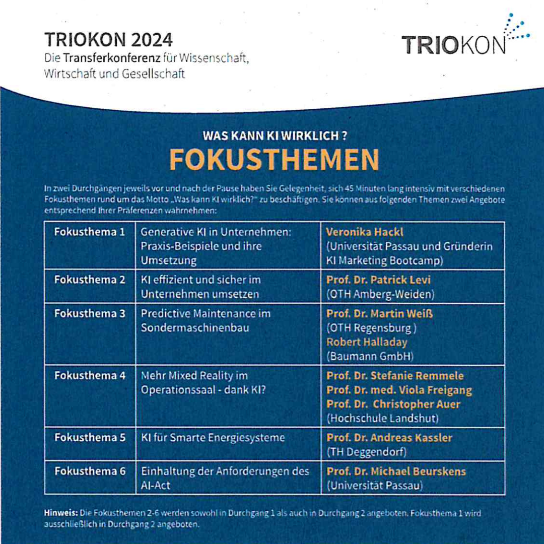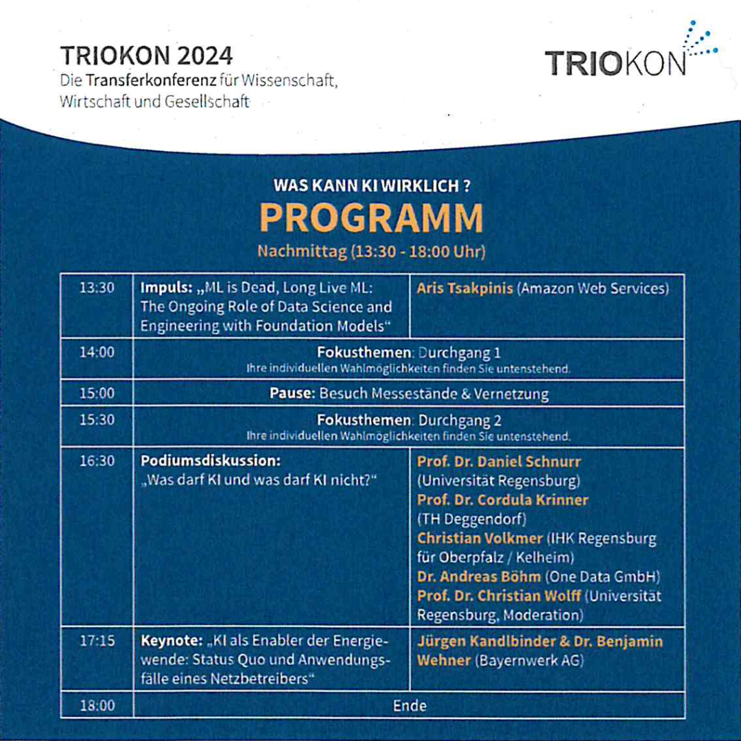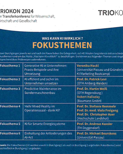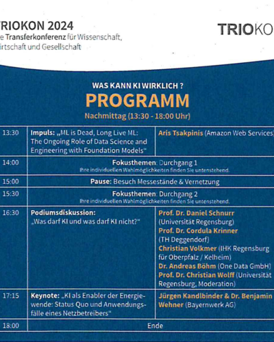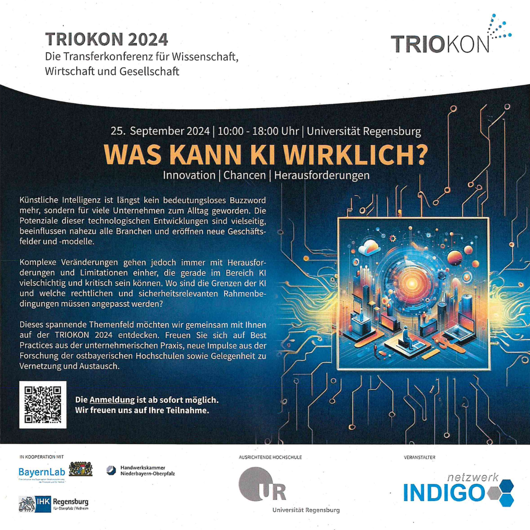 Auch in diesem Jahr findet erneut die Transferkonferenz TRIOKON statt, zu der wir Sie am 25. September 2024 an die Universität Regensburg einladen möchten! Dieses Mal findet die Konferenz zum Thema „Was kann KI wirklich? – Innovation | Chancen | Herausforderungen“ statt.